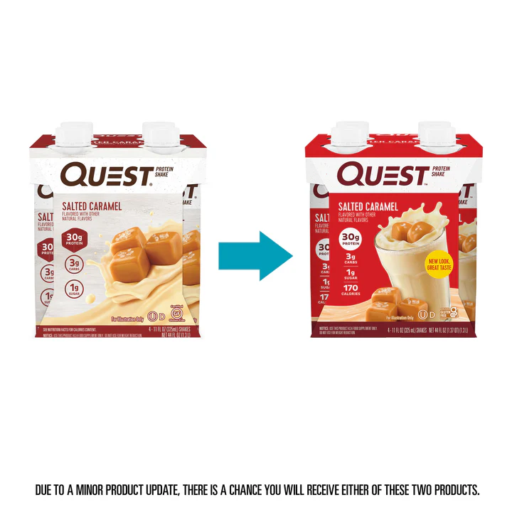 • DESERVEDLY DECADENT. The Quest Salted Caramel Protein Shake is the irresistibly-creamy, salted caramel-flavored shake you can enjoy anytime with 30g of protein, 3g carbs and 1g of sugar per serving.