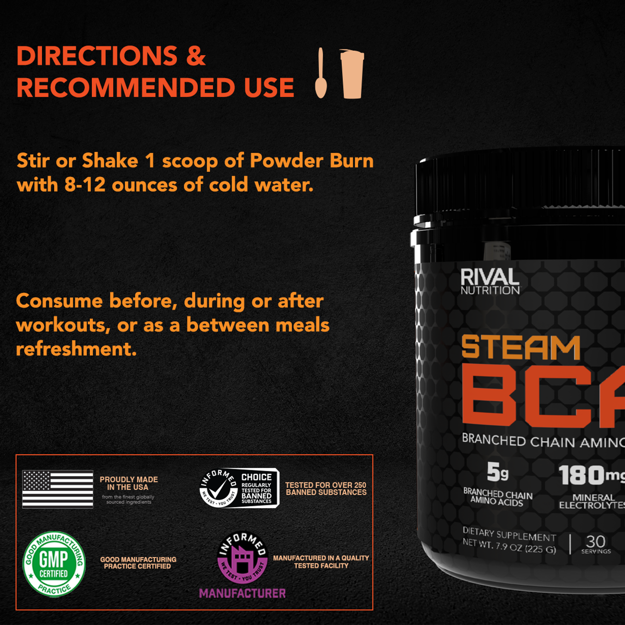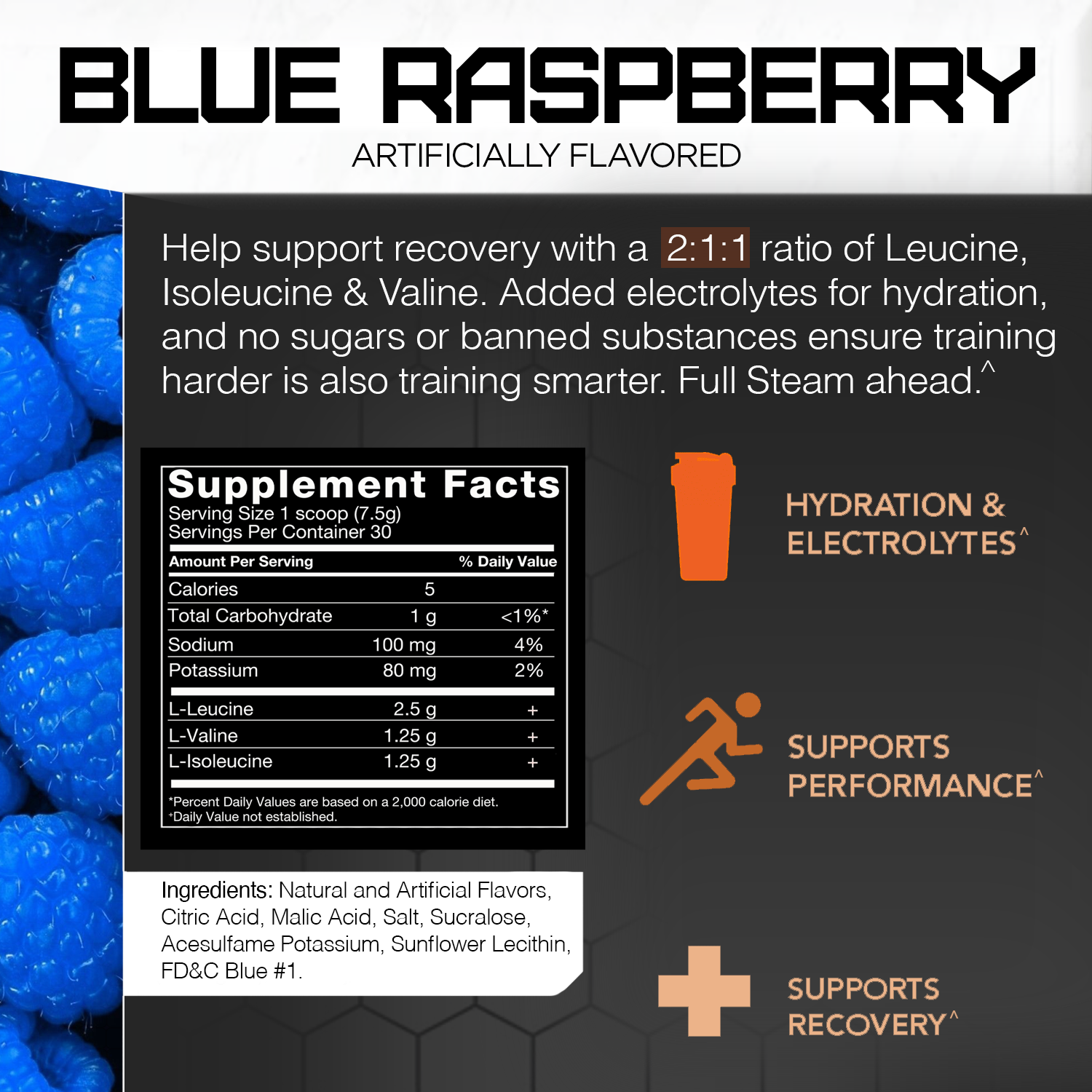 About one third of skeletal muscle – the type that flexes and gets stronger when you exercise – is made up of branched-chain amino acids (BCAAs). So it shouldn’t be that surprising to learn that athlete’s requirements for leucine, isoleucine, and valine are higher, or that supplementing with these key aminos has been scientifically demonstrated to improve performance. STEAM BCAA helps support recovery with a 2:1:1 ratio of leucine, isoleucine and valine. Added electrolytes for hydration, and no sugars or banned substances simply ensure training harder is also training smarter. Full STEAM ahead.